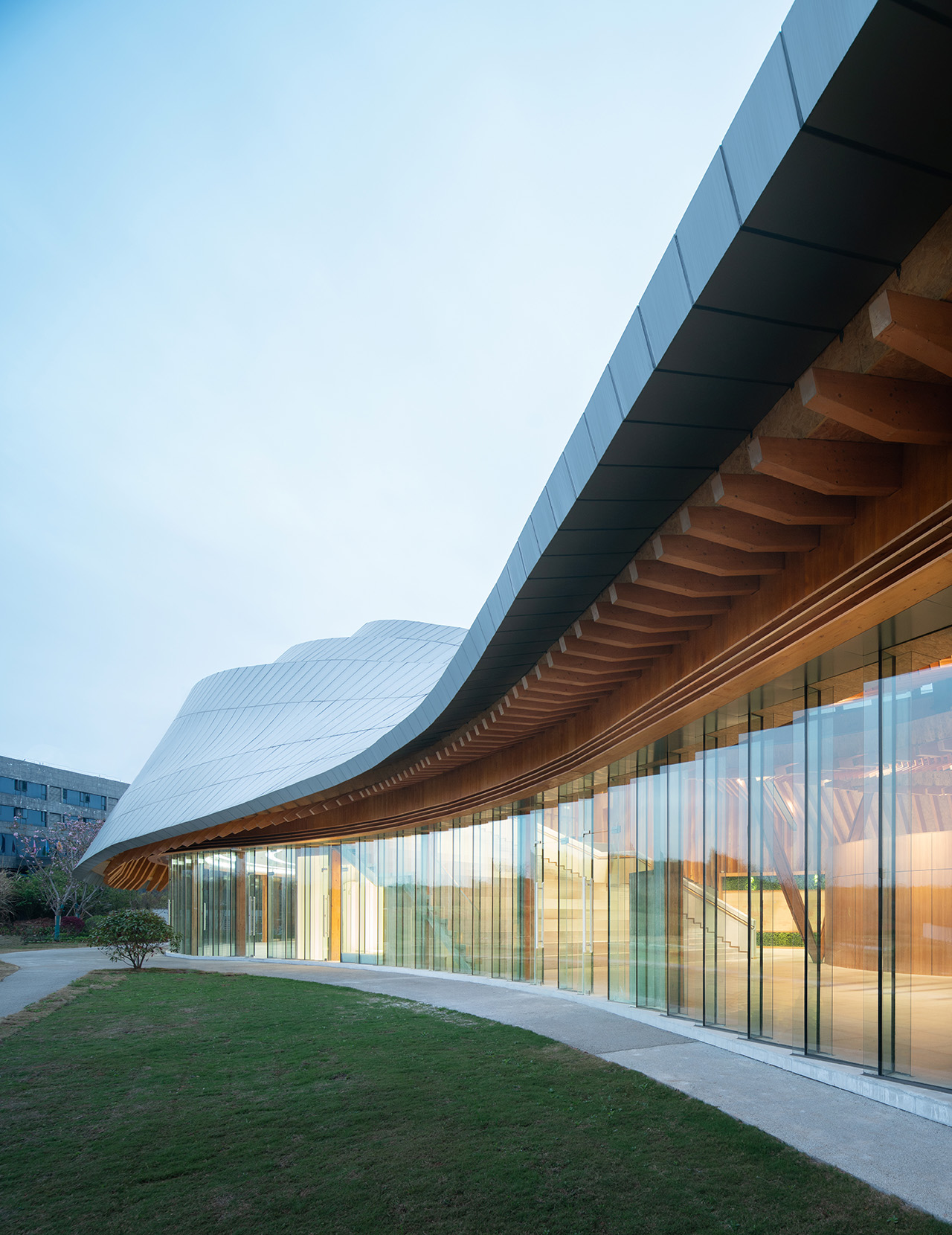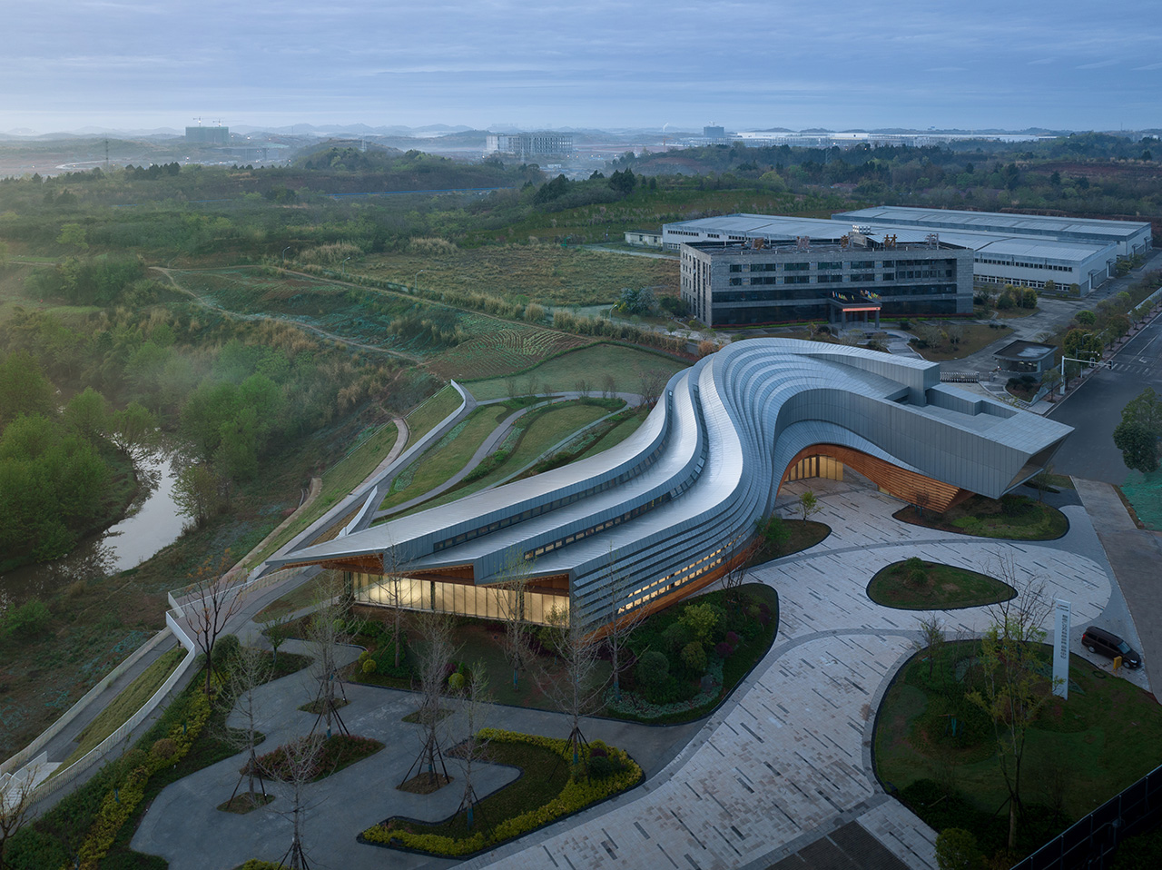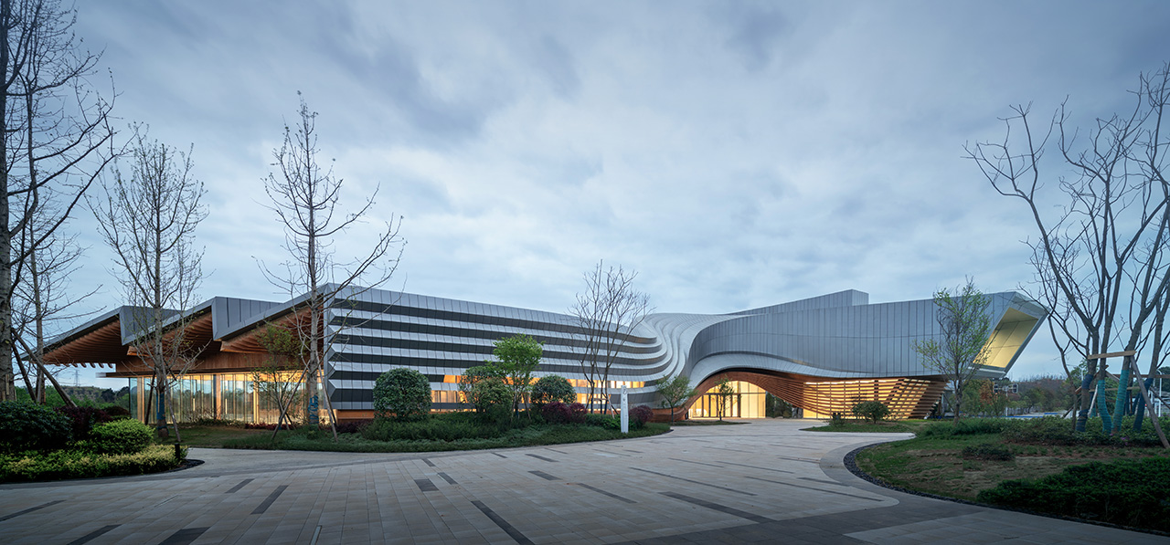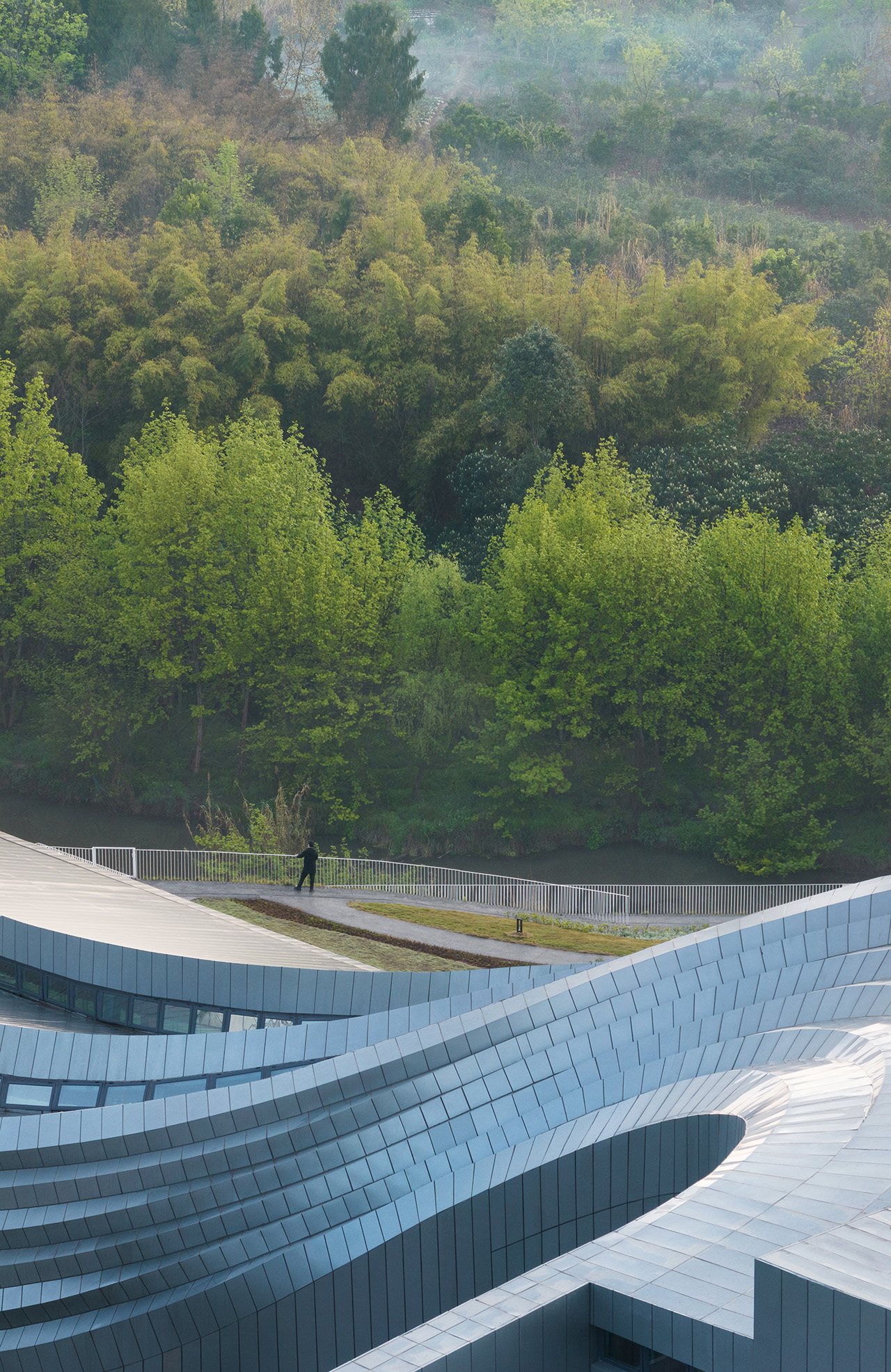 设计之初,焦点并未仅仅集中于建筑,我们以自然水流为灵感的一组灵动的线条,在快速城市道路和河水之间分割限定整个场域,前场、后场的景观在流动的空间里自然浮现,建筑的形体如同一处被凝固的水波涡旋,定义了被锚固于场地内的瞬间。