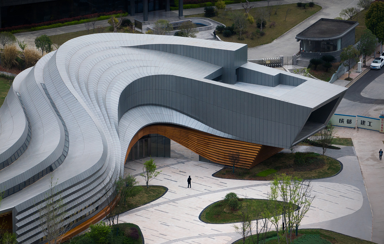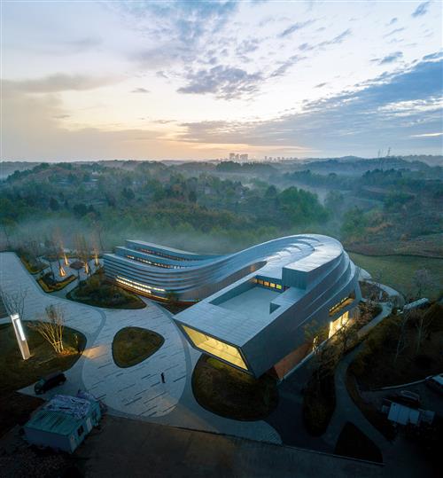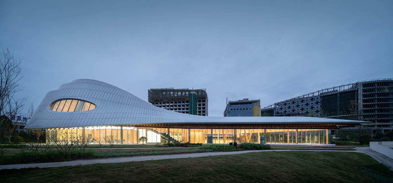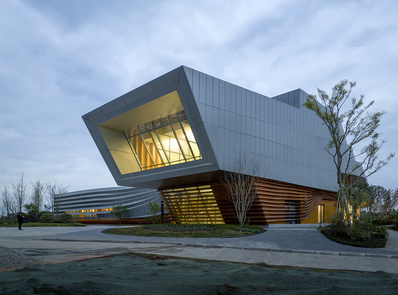 设计之初,焦点并未仅仅集中于建筑,我们以自然水流为灵感的一组灵动的线条,在快速城市道路和河水之间分割限定整个场域,前场、后场的景观在流动的空间里自然浮现,建筑的形体如同一处被凝固的水波涡旋,定义了被锚固于场地内的瞬间。