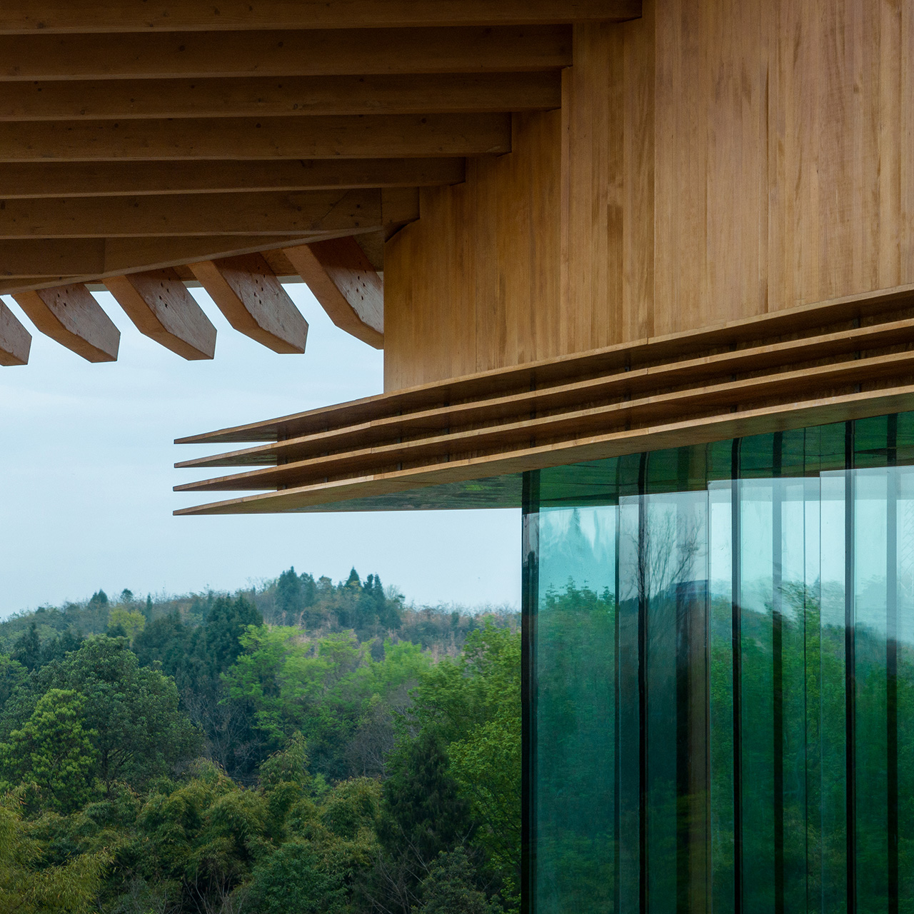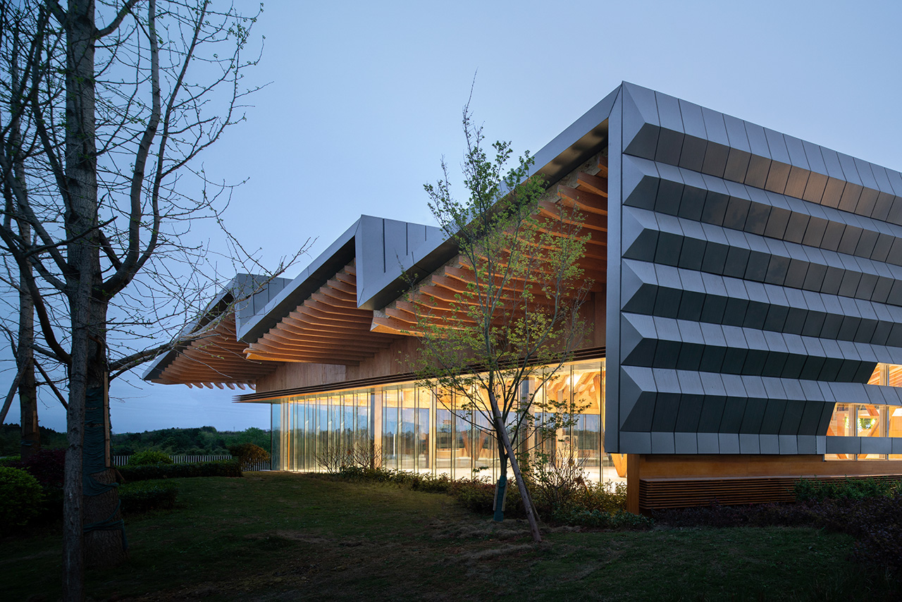 可拆卸的节点设计为建筑提供了一种低消耗建造的可能,构建了一个具有流动感和呼吸感的有机体。而结构的逻辑真实的反映在空间的界面上,也作为室内饰面,随着形体的起伏呈现出一种变化的肌理。外表面材料的铝板和玻璃,继承了内在的结构逻辑,以横向细密的分缝确保了每块材料的平整,符合加工逻辑,相互错动的横缝凸显了纵向分缝的连续性,有序的材料划分便可以贴合在整个空间的流动动势里。