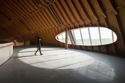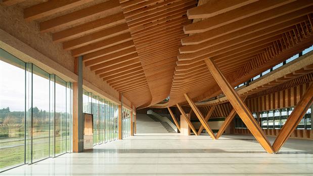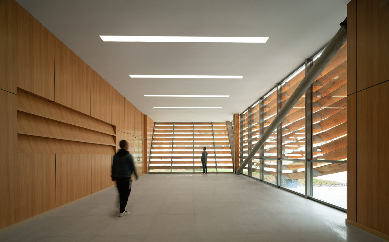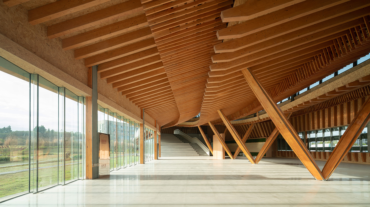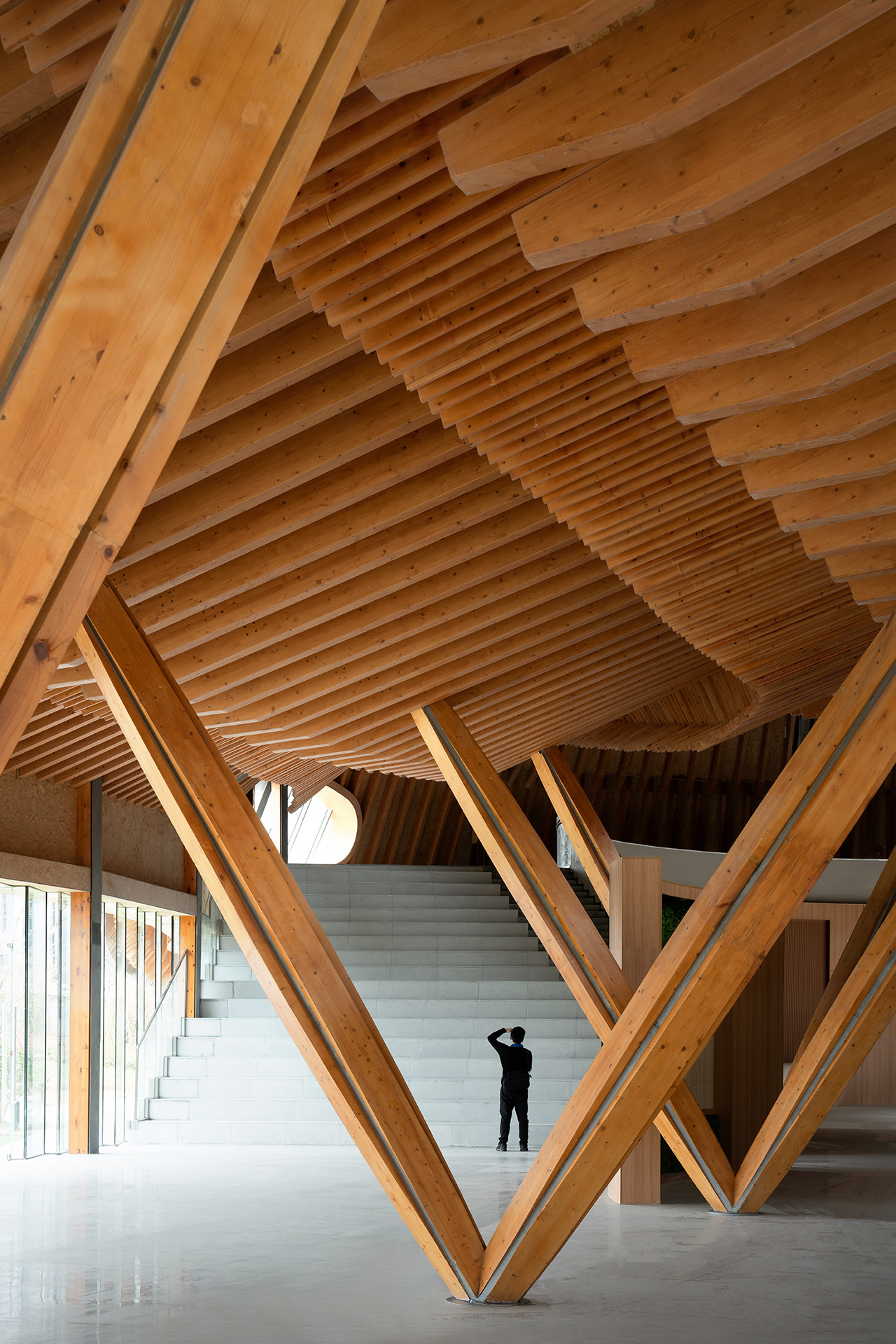 相较于环境中的传统钢筋混凝土建造方式,项目选择了可再生的钢和木材,这样的决定不仅体现了对可持续性的执着,也使得这座建筑仿佛是一件被编织出来的艺术品。在混凝土的基座之上,直线的钢材和木材以一种充满张力的方式交织,形成一种充满活力的曲面空间。