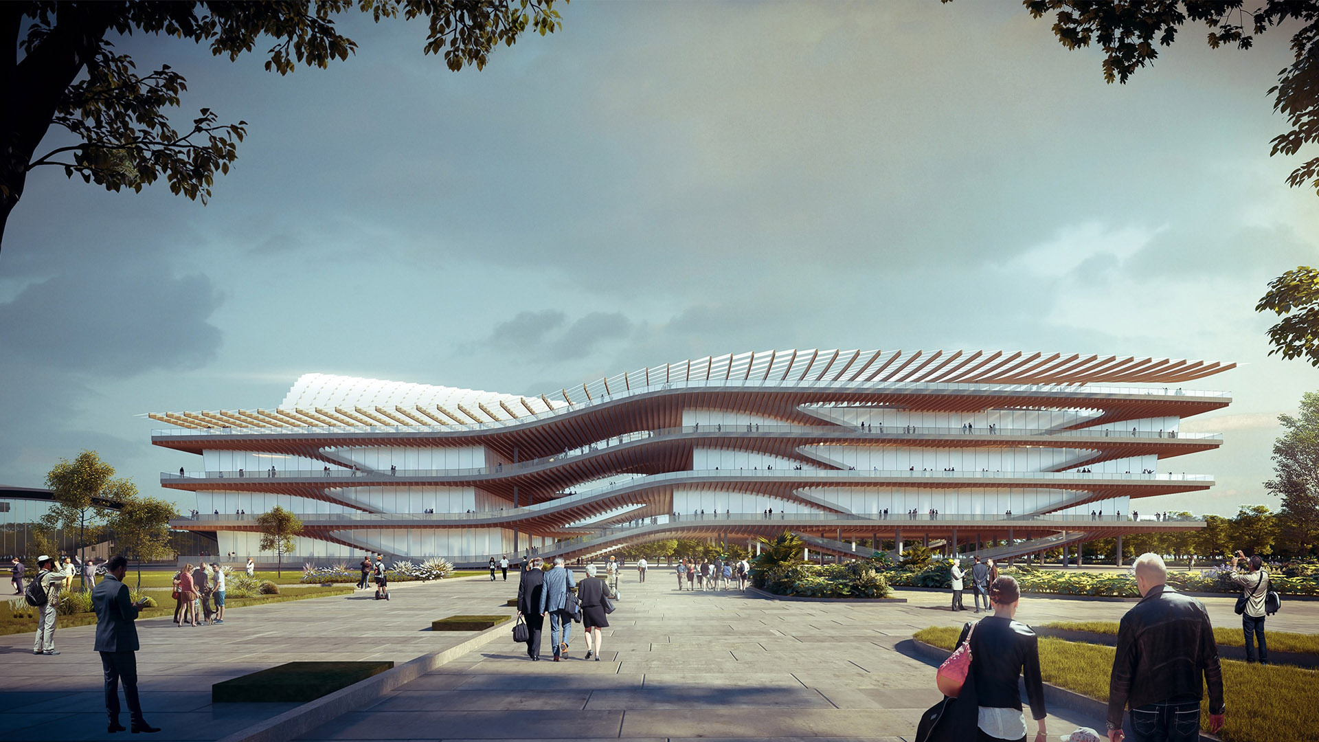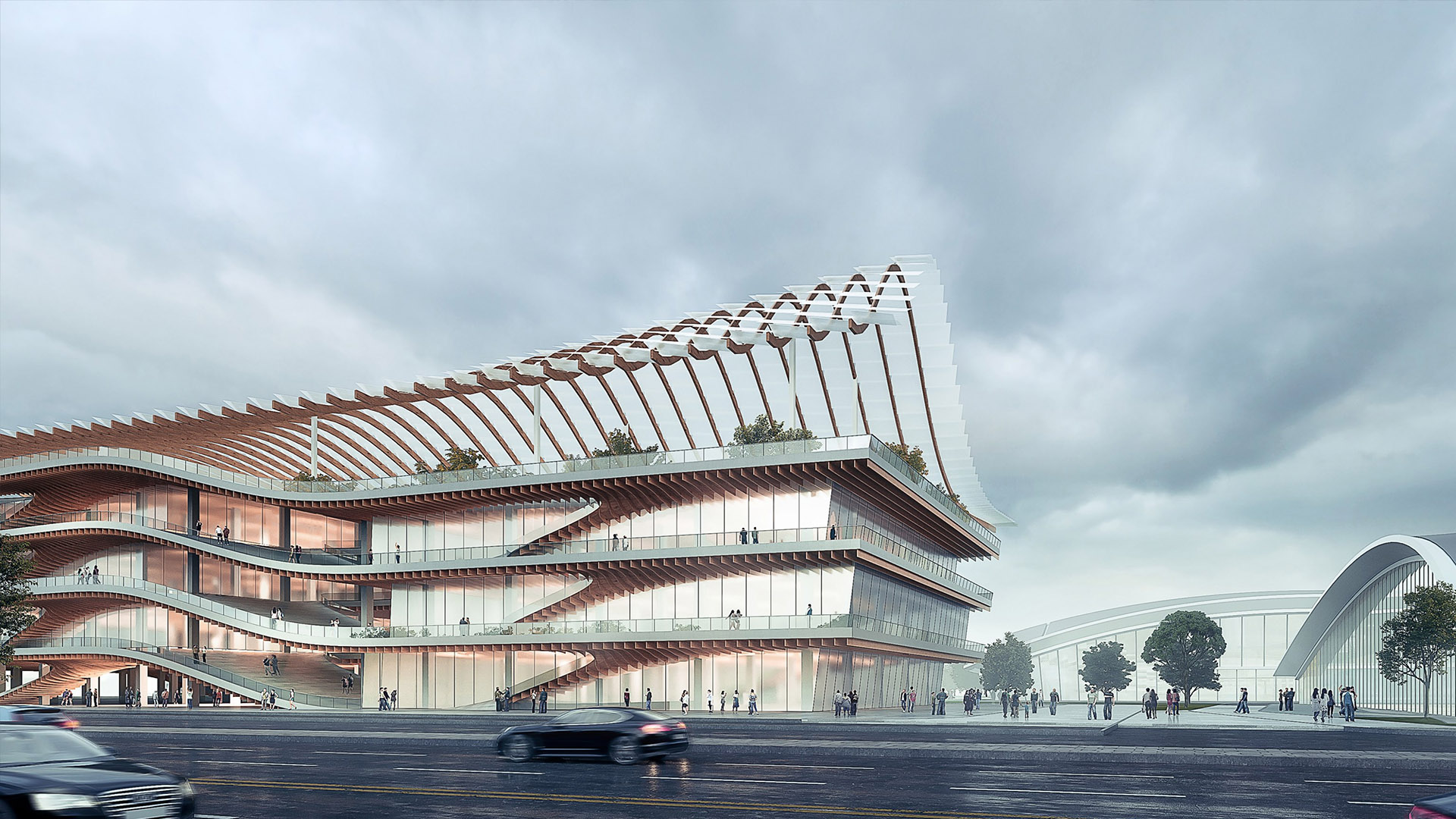 An overlapping shape of water waves is immediately apparent. The leaping floor and translucent cover create rich visual levels, forming the external movement line of the whole venue, connecting the existing square and road, making the whole facade become a space for people to visit and integrate into the cultural travel system of Wuzhen. The whole roof is planned as a covered garden, like a greenhouse of plants, injecting a vibrant natural color into the dark roof texture of Wuzhen. The exhibition space of the science and technology museum is wrapped by this moving line, which can be flexibly divided according to functions and needs. The internal exhibitions are not affected by external influences, and the interaction of various elevations can even be formed through partial openings according to needs, so as to meet the needs of modern science and technology exhibition hall for diversified displays and rich communication activities.