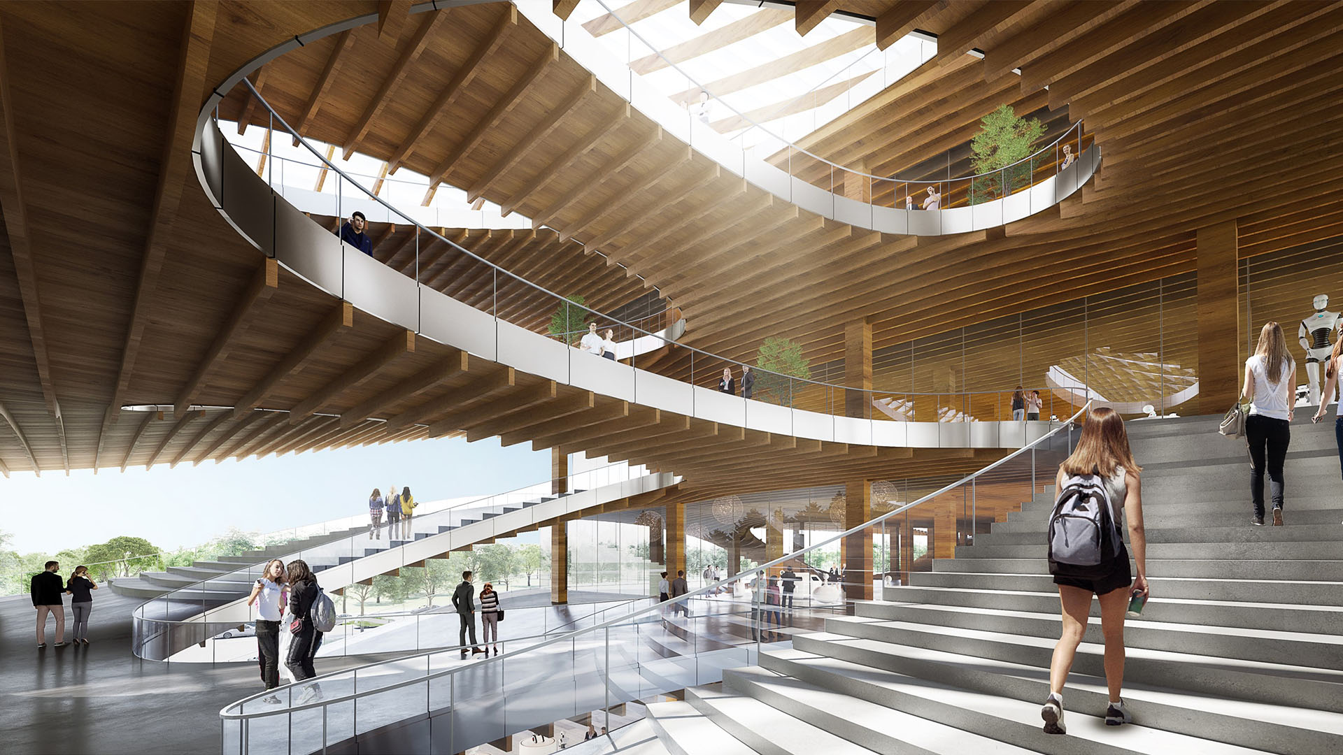 现代的外形依然有一个自然亲和的内在,我们选择木结构来处理整个系统内核,四周宽大的挑檐与周边建筑形成一种协调的同构,屋檐下木材温暖的空间氛围,暗含了我们对于未来科技的人文期许。